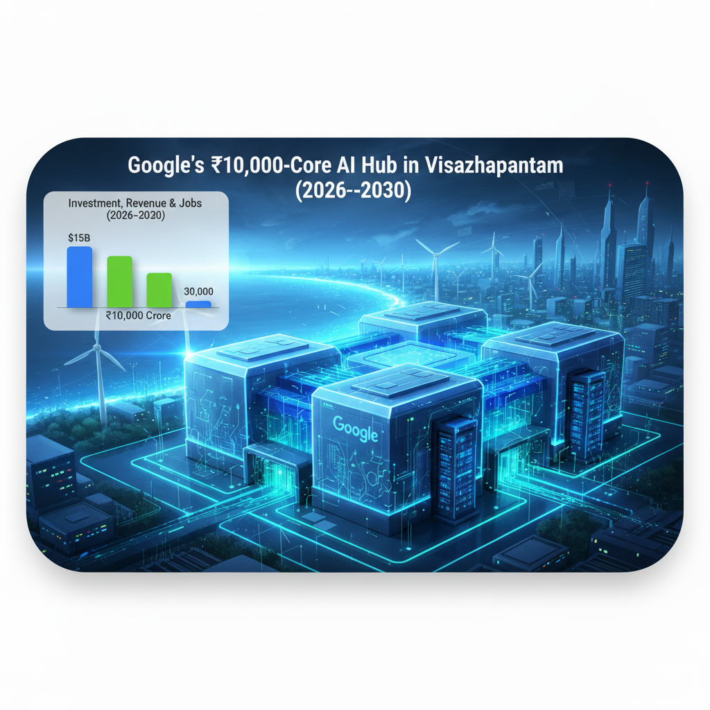 New Delhi, 14 Oct 2025 – As per PIB’s latest release, Google will invest nearly $15 billion (₹10,000 crore) to establish India’s first 1-GW hyperscale data centre and AI hub in Visakhapatnam, generating over 30,000 jobs and transforming Andhra Pradesh into a leading digital hub.