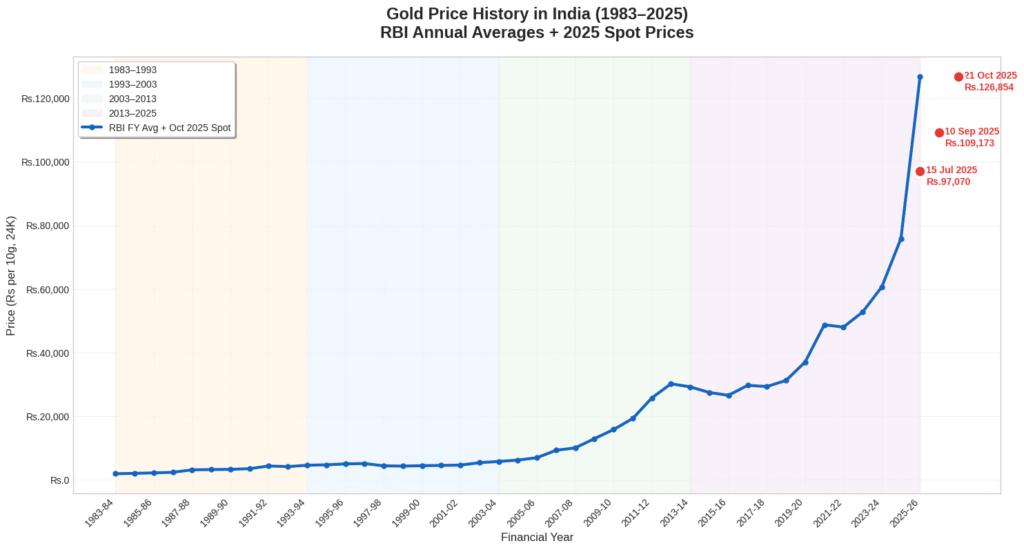 India’s fascination with gold isn’t just cultural – it’s economic. From weddings to investments, gold plays a central role in Indian households. But how much has gold grown in India? In 1983, it was just ₹1,858 per 10g. In 2025, it reached ₹1,26,854 per 10g (as of 21 October 2025). Backed by RBI data, this 42-year journey of gold price history in India reveals gold’s CAGR, growth spikes, and insights for investors.