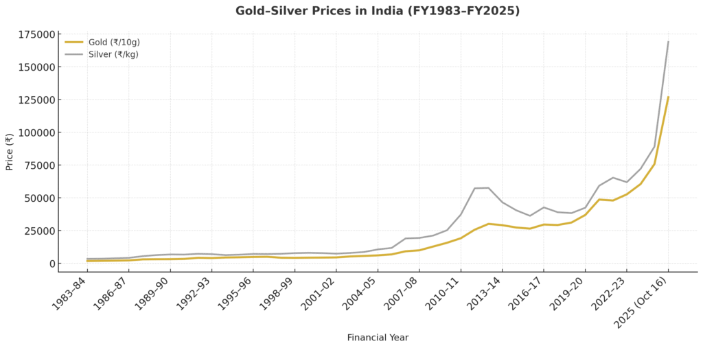 Between FY 1983–84 and 2025, gold rose from ₹1,858 to ₹1,26,815 per 10g, while silver increased from ₹3,506 to ₹1,69,090 per kg.