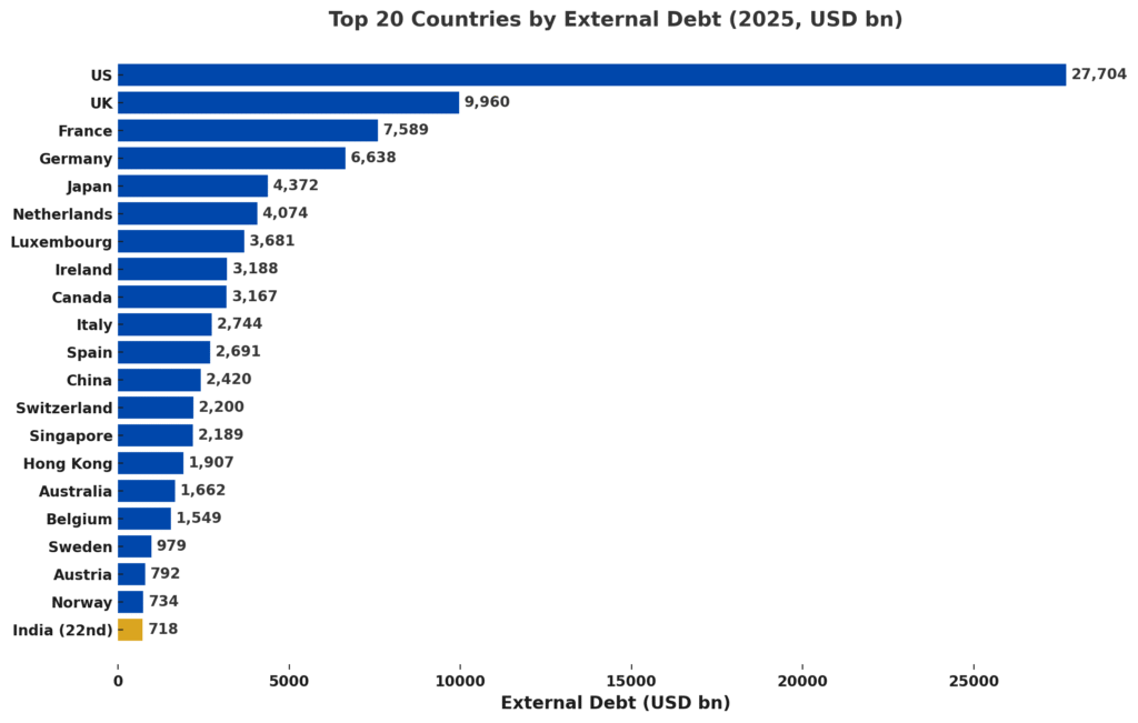 India ranks 22nd globally in absolute external debt. Per capita, India’s debt (~USD 515) is far lower than advanced economies like the US (~USD 80,000) or UK (~USD 100,000).