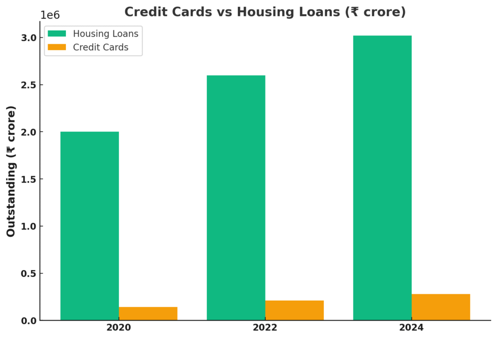 - Credit card outstanding doubled in 5 years, hitting ₹2.8 lakh crore in FY 2023–24.