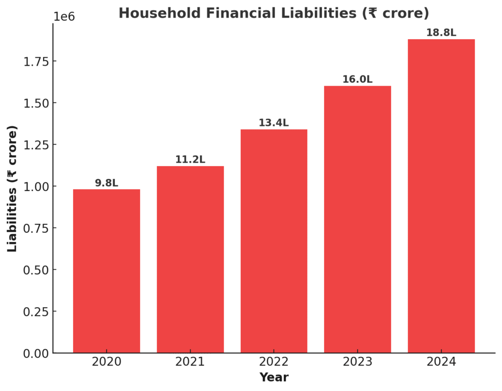 - Household financial liabilities surged to ₹18.8 lakh crore in 2023–24, nearly doubling from two years ago.