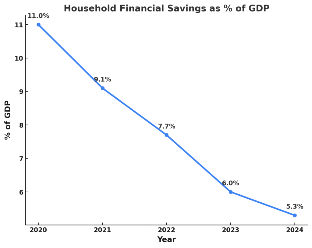 - Household gross financial savings were 11% of GDP in FY 2020–21, but dropped to 5.3% in 2023–24.