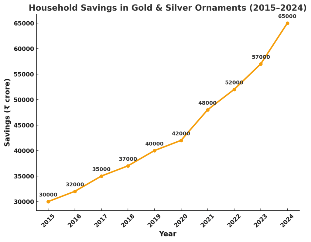 - Despite fintech apps and SIP culture, Indians saved ₹65,000 crore in gold & silver ornaments in 2023–24 — almost the same as FY 2022–23.