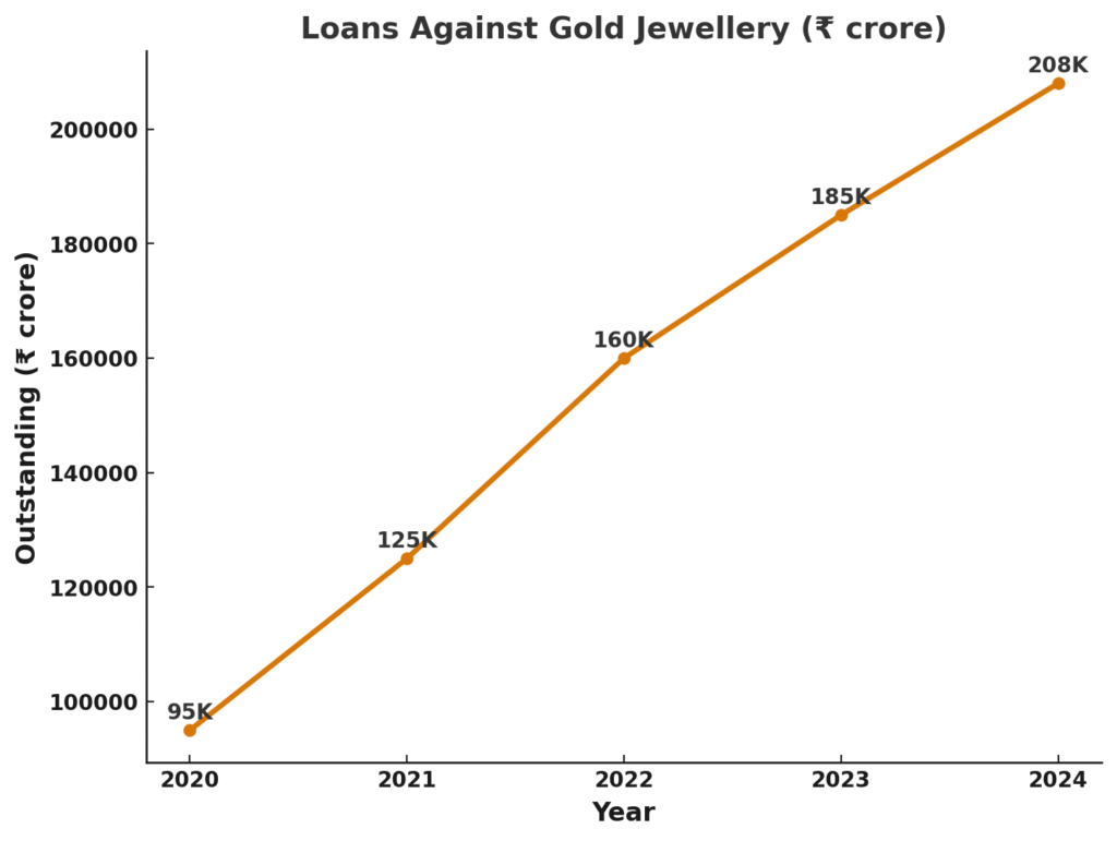 - Loans against gold jewelry surged 2x in just two years, touching ₹2.08 lakh crore in 2023–24.