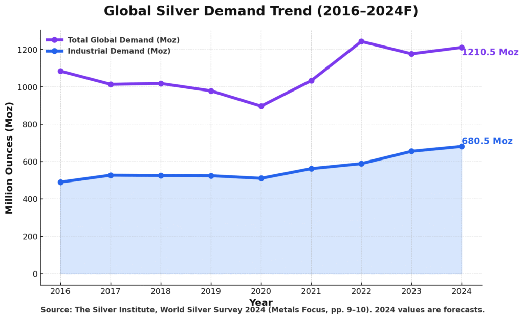 Source: The Silver Institute, “World Silver Survey 2024” (Metals Focus, pp. 9–10). 2024 values are forecasts.