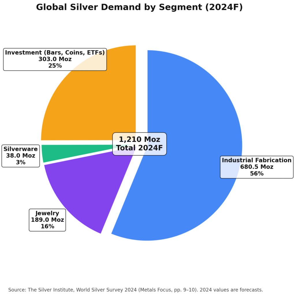 So, 680.5 Moz of global industrial demand in 2024 equals roughly 21,150 tonnes of silver – illustrating how massive the industrial use of the metal has become.