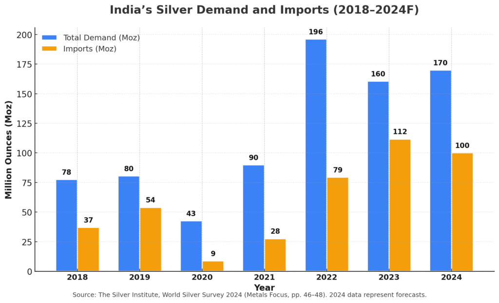 India imports over 80% of its silver needs, as domestic mining is limited.